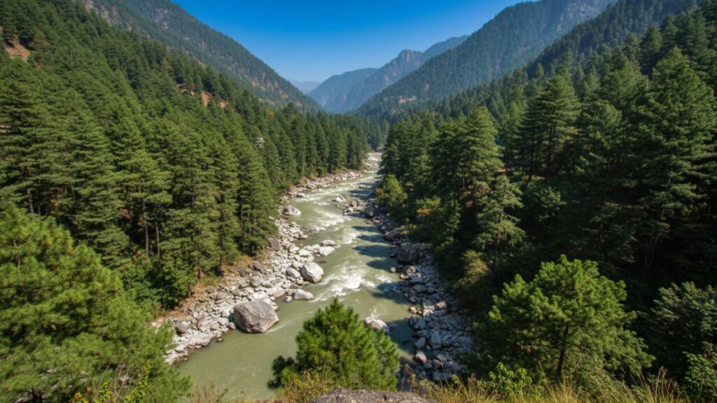 There are several viewpoints where the trail opens up to give you full river views. Around the 20-minute mark, there’s a flat rock outcrop on the left where locals stop for chai breaks. From here, you can see the river bending around boulders with pine-covered ridges rising on both sides.